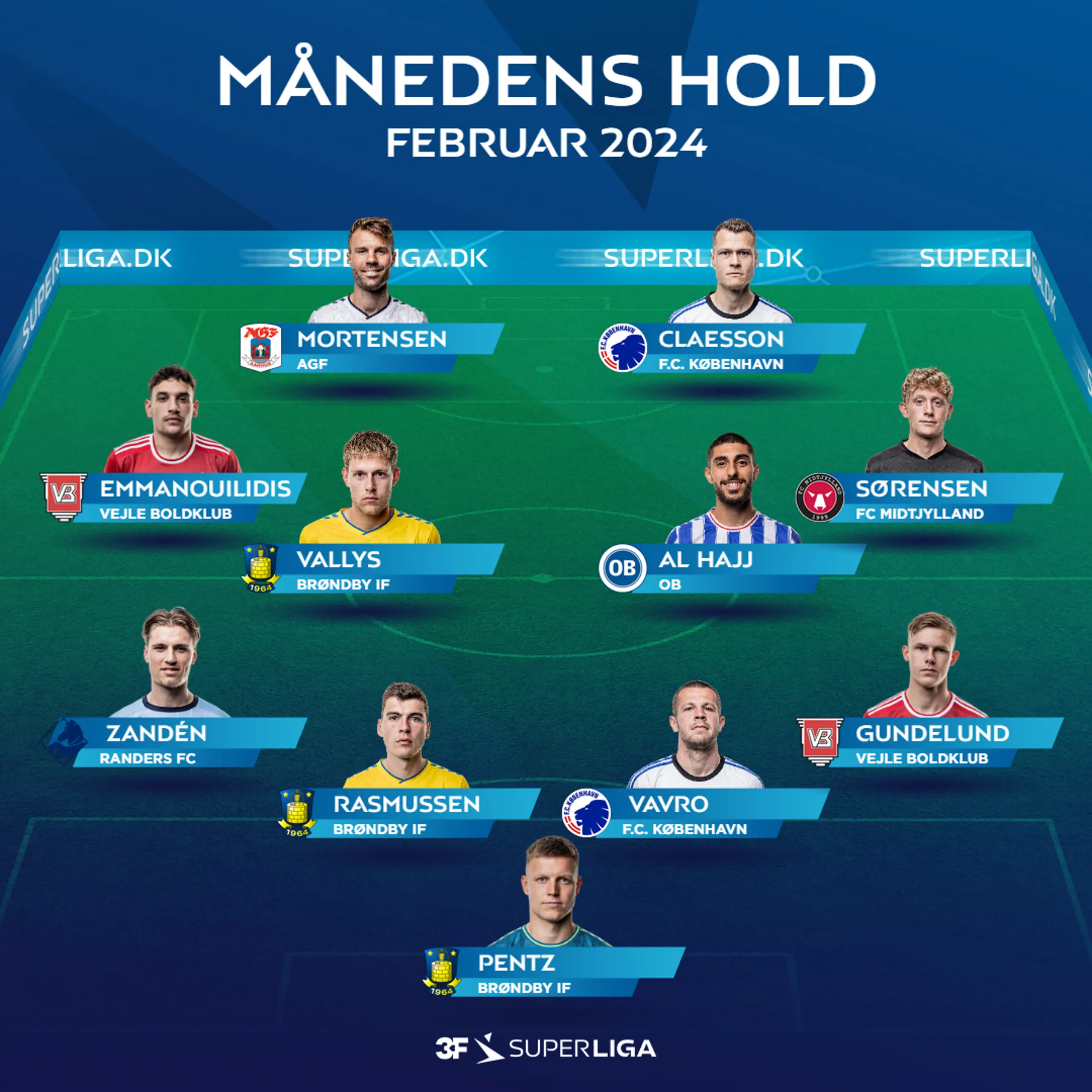 Jens Dresling/Ritzau Scanpix Månedens Hold i februar 2024 28.02.2024 12:39 Tre Brøndby profiler fører an Månedens Hold i februar, hvor spillere fra hele syv forskellige klubber har fundet vej til start 11'eren.