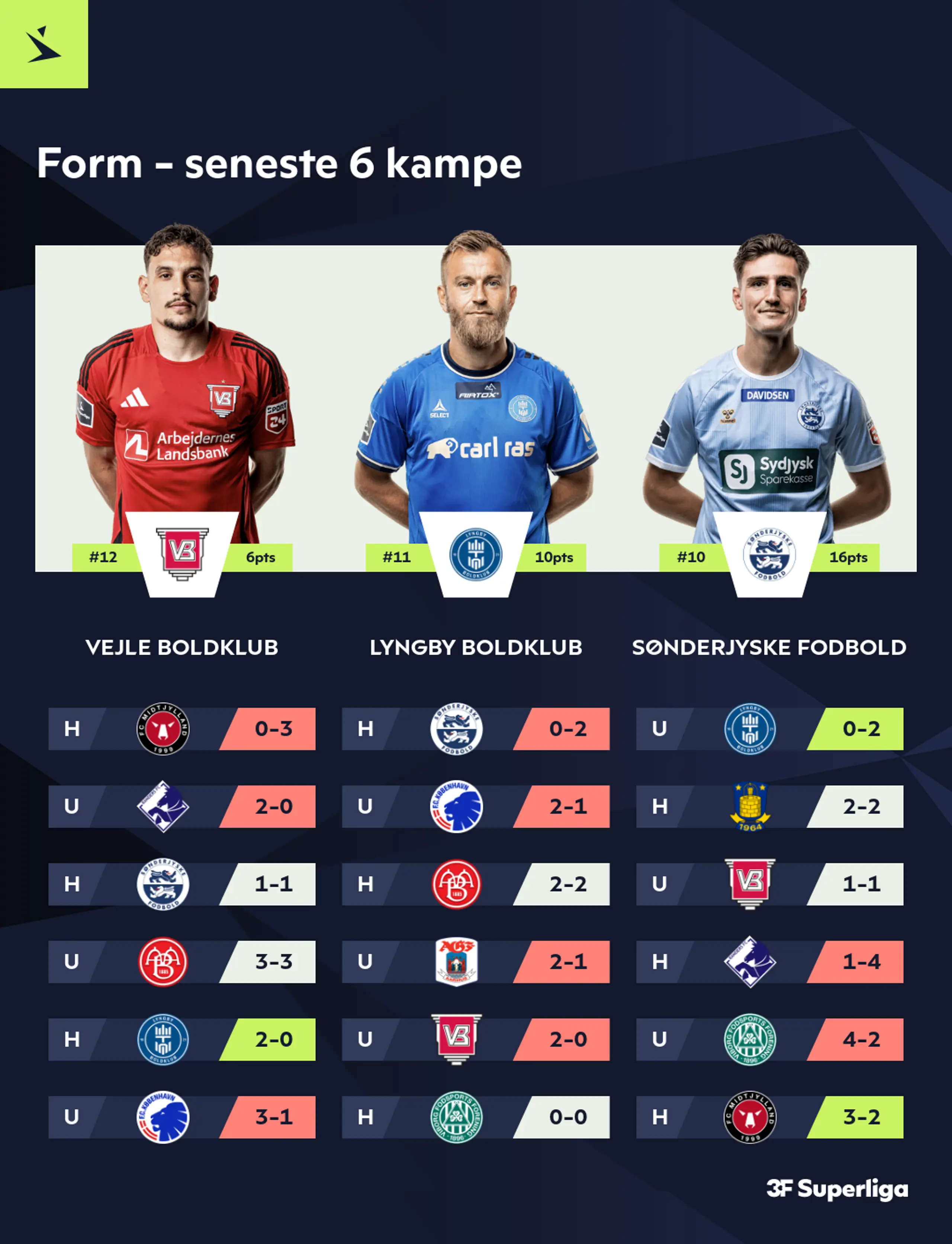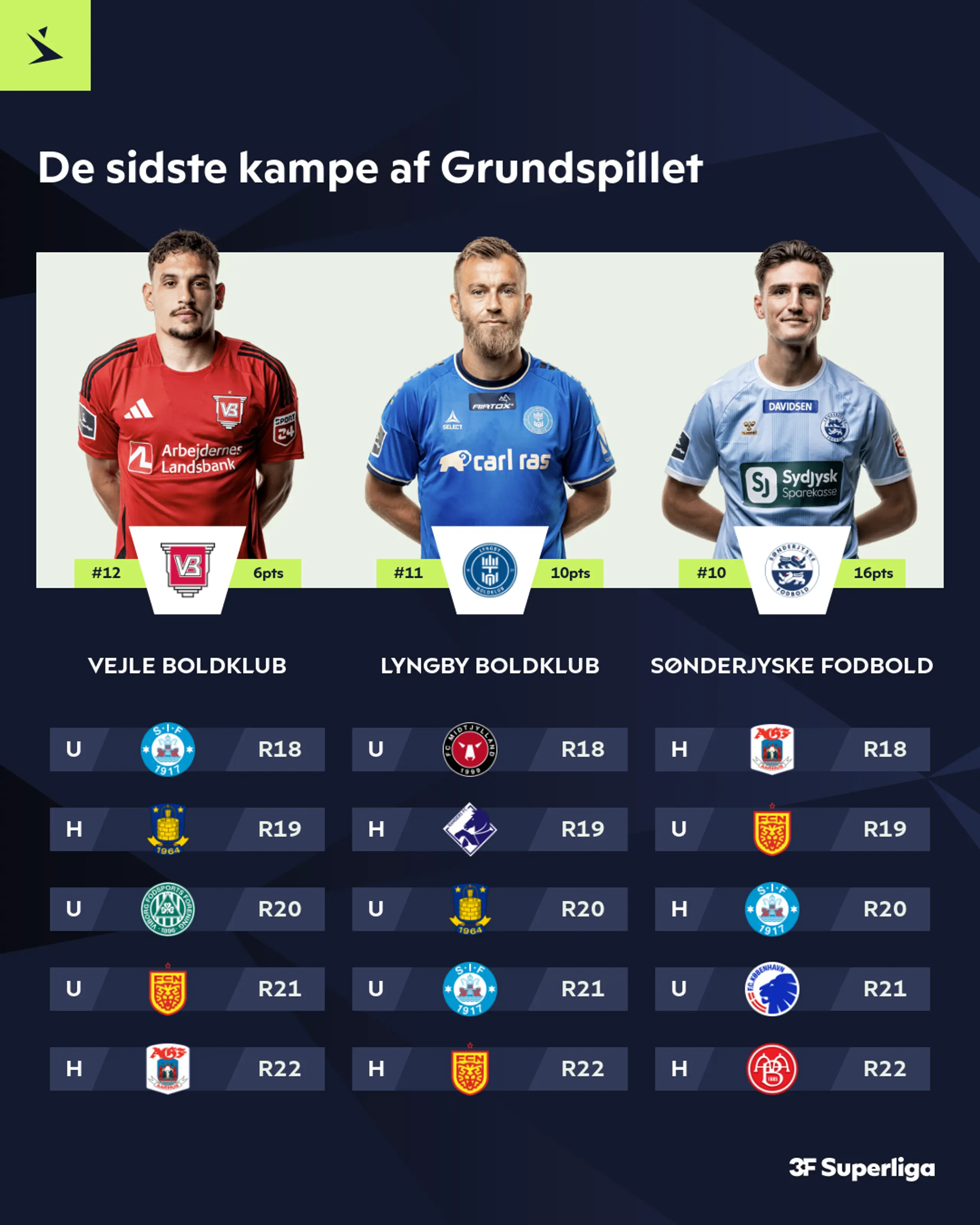 Der er snart kickoff til forårssæsonen i 3F Superliga, og derfor ser vi nærmere på, hvor de 12 klubber står lige nu. Når bolden ruller igen, så er der kun en ting der tæller for Vejle Boldklub, Lyngby Boldklub og Sønderjyske Fodbold – der skal sikres så mange point som muligt i kampen om overlevelse. De sidste par sæsoner har både Vejle Boldklub og Lyngby Boldklub prøvet at være i en svær situation ved vinterpausen og klaret skærene, og spørgsmålet er, om de kan gøre det igen.